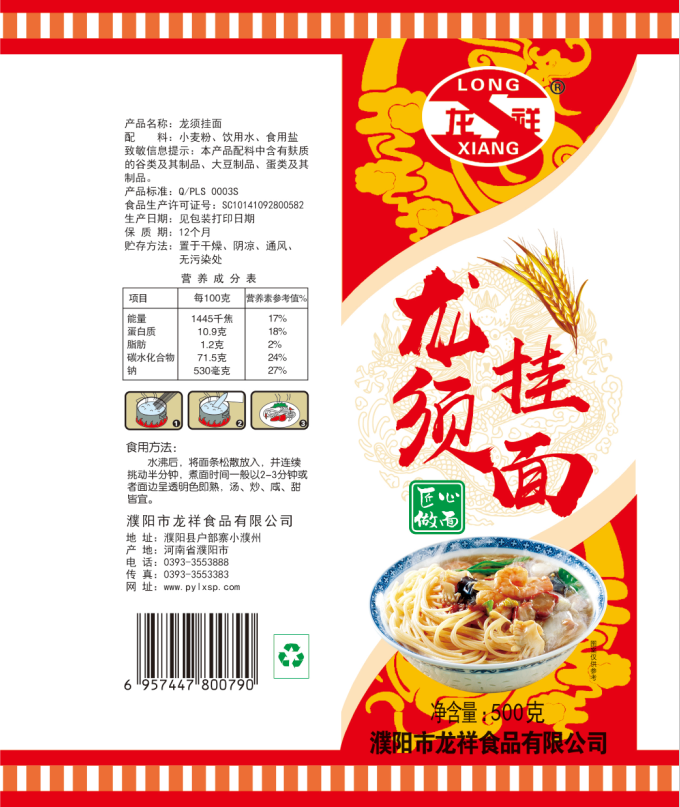 濮陽市龍祥食品有限公司位于河南省濮陽縣戶部寨鎮(zhèn)小濮州,始建于1994年,前期投資200萬元,經(jīng)過幾年的努力,大力開發(fā)市場,由于市場的需求量急劇上升,出現(xiàn)供不應(yīng)求,于2004年擴(kuò)建,建成一座新型的現(xiàn)代化面粉加工企業(yè),并擁有全國先進(jìn)全自動(dòng)生產(chǎn)設(shè)備一套,產(chǎn)量由以前的100噸/天,提高到現(xiàn)在400噸/天。 2012年再次擴(kuò)大規(guī)模申請為濮陽市龍祥食品有限公司,注冊資金500萬元。2012年又投資800萬元新建掛面生產(chǎn)線一條,日產(chǎn)掛面50噸。龍祥食品有限公司現(xiàn)有職工120余人,總工程師1人,專業(yè)技術(shù)人員10人,經(jīng)濟(jì)師1人,會計(jì)師1人,銷售人員2人,優(yōu)秀專業(yè)人員20余人。  龍祥公司自創(chuàng)建以來,社會效益十分可觀。公司一直以“今天的質(zhì)量,明天的市場”為信念,“一切為了客戶需求,竭誠追求完美品質(zhì)”為企業(yè)宗旨,走專業(yè)化經(jīng)營和職業(yè)化管理的路子。